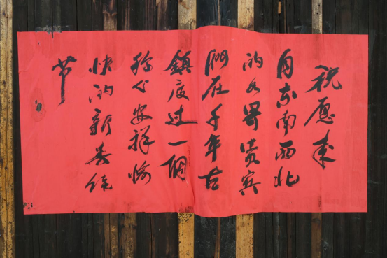 泾溪水镇内庞焕泰先生亲笔书写的红纸语言景观 通讯员 吕彭怡然 摄