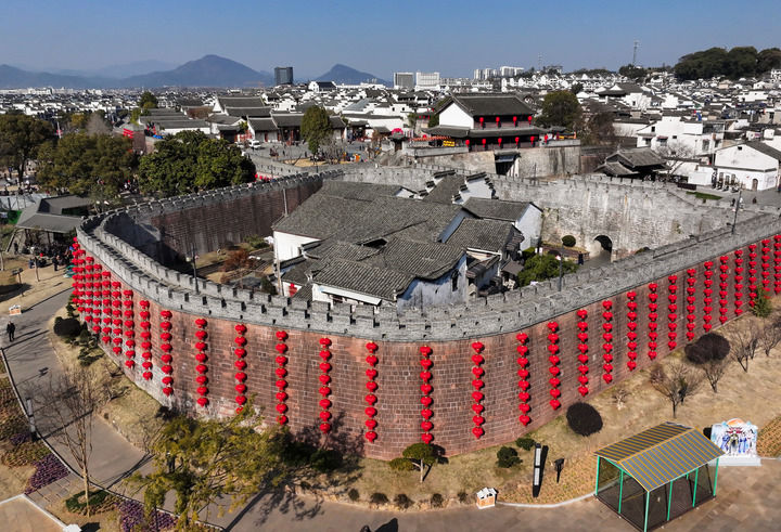 大红灯笼扮靓徽州古城(2024年1月25日摄,无人机照片)。新华社发(施亚磊摄)