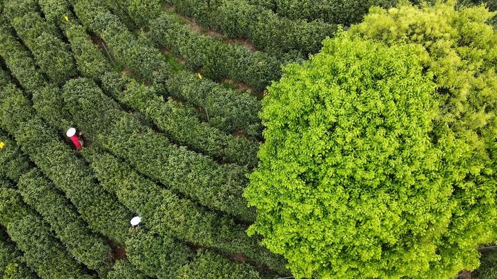 2024年4月10日,黄山市祁门县历口镇的茶农在采摘春茶(无人机照片)。新华社记者 张端 摄